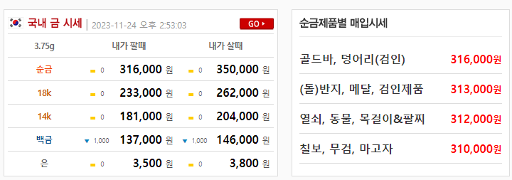한국표준금거래소는 시세 변동이 큰 경우 평일 오전 11시 이전에 주문한 건에 대해서는 추가로 금액이 발생하거나 또는 환불이 이루어질 수 있다고 합니다. 금값시세는 3.75g을 기준으로 하며 2023년 11월 24일 24K 순금의 시세는 내가 살 때 355,000원이며 팔 때는 315,000원입니다. 18K를 팔 때는 231,500원에 거래가 가능하며 14K의 경우 179,500원에 거래 중입니다. 이 곳 또한 한국금거래소와 동일하게 매수할 때는 제품 시가의 적용을 받게 됩니다.