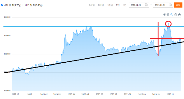 추세가 바뀌며 상승하는 듯 보였던 금시세 1돈가격은 10월 수직으로 하락을 보입니다. 그리고 이스라엘-팔레스타인 전쟁의 소식이 전해지면서 갑자기 오르기 시작합니다. 금시세 1돈가격 2023년 1