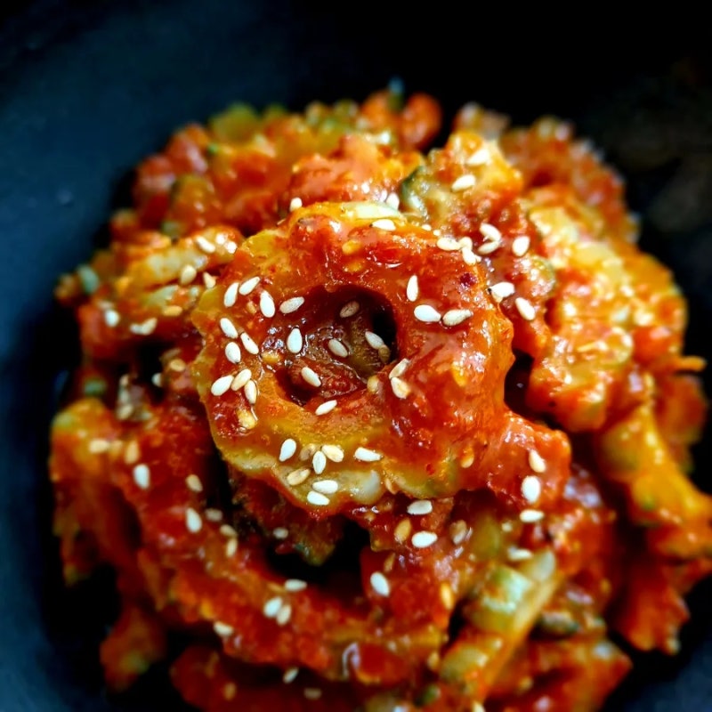 여주 조림: 간장과 올리고당을 넣어 짭조름하게 조려내면 여주 고유의 아삭한 식감과 감칠맛이 살아나 밥도둑이 따로 없습니다.