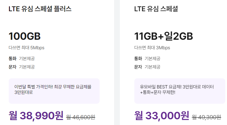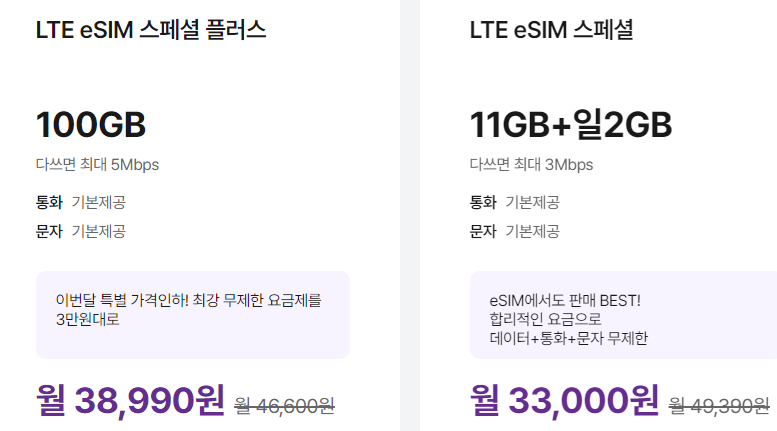 유심이 필요없는 eSIM요금제도 있습니다 . 인기 추천 유심요금제는 월 3만원대 요금제로 100GB까지 사용할 수 있습니다. 또한 월 1만원대 5G를 사용할 수 있는 요금제도 있습니다.