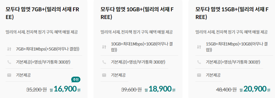 선택한 요금제를 이용하고 있는 동안에는 밀리의 서제 이용이 무조건 무료입니다. 밀리의 서재만 이용해도 한달에 9900원이 발생하는데 알뜰폰 요금제를 선택하면 이 비용까지 절약할 수 있습니다.