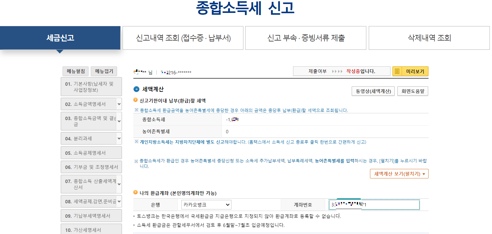 12. 마지막으로 세액이 계산됩니다. 환급받거나 혹은 추가 납부해야할 세액을 확인할 수 있습니다. 만약 환급액이 존재한다면 환급계좌 정보를 입력할 수 있습니다.