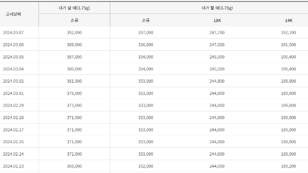 작년에 비해서 35000원 가량 오른 상태입니다. 18K와 14K는 세공을 해야하기 때문에 제품의 시세를 적용받은 금액으로 매수할 수 있습니다.