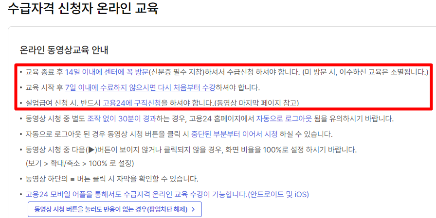 2. 수급자격 신청자를 위한 온라인 교육의 시청이 필요합니다. 안내사항을 확인한 후 동영상시청을 시작합니다.